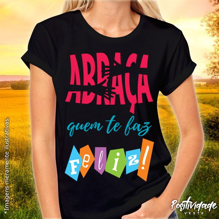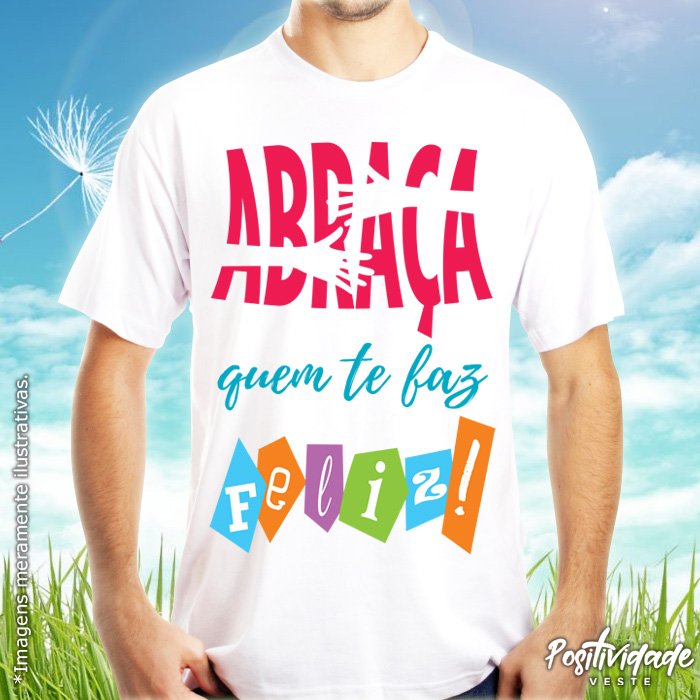 Camiseta meia manga, 100% algodão, fio 30.1, penteada 175g, com costuras duplas na gola e ombros. Estampa “Abraça quem te faz feliz!”.