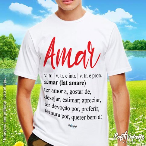 Camiseta meia manga, 100% algodão, fio 30.1, penteada 175g, com costuras duplas na gola e ombros. Estampa “Amar”.