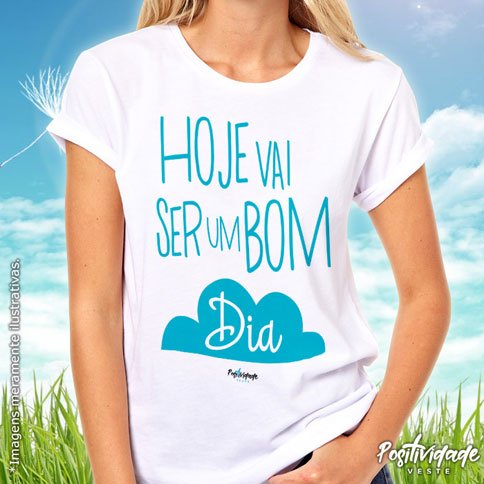 Camiseta meia manga, 100% algodão, fio 30.1, penteada 175g, com costuras duplas na gola e ombros. Estampa “Hoje vai ser um bom dia”.