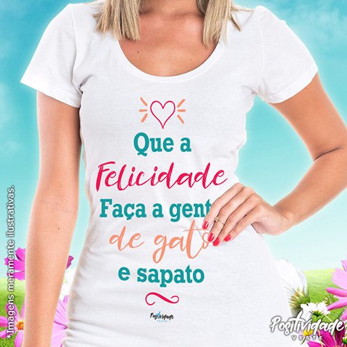Camiseta meia manga, cor branca, 100% algodão, fio 30.1, penteada 175g, com costuras duplas na gola e ombros. Estampa “Que a felicidade faça a gente de gato e sapato.”.