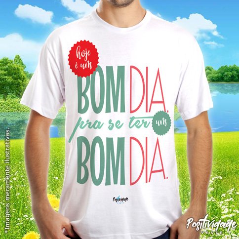 Camiseta meia manga, 100% algodão, fio 30.1, penteada 175g, com costuras duplas na gola e ombros. Estampa “Hoje é um bom dia para se ter um bom dia.”.